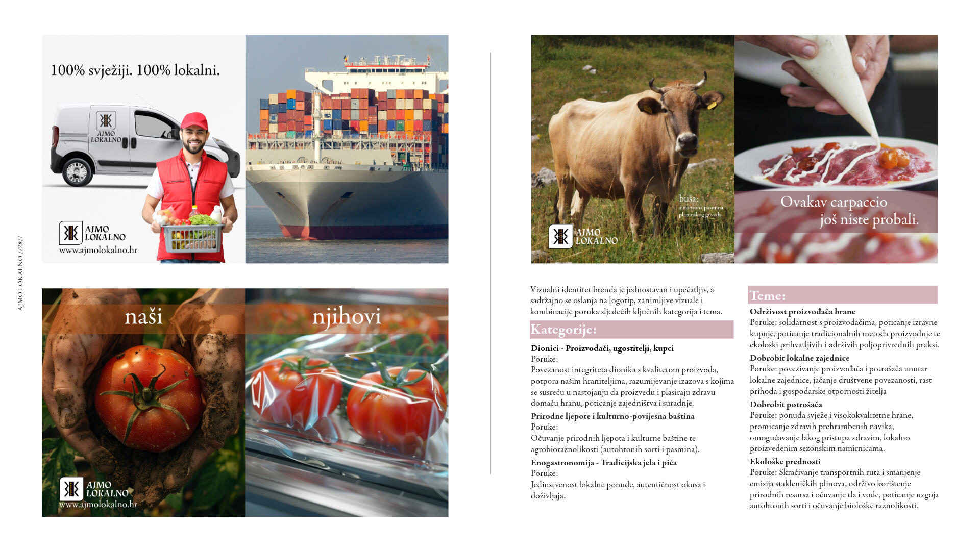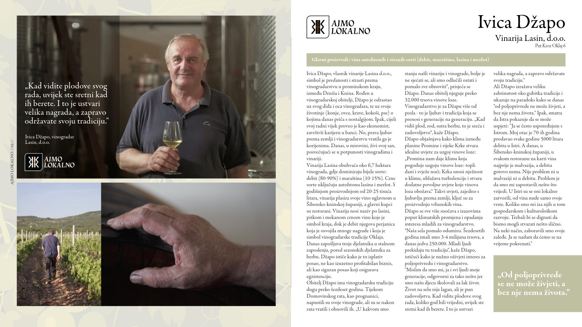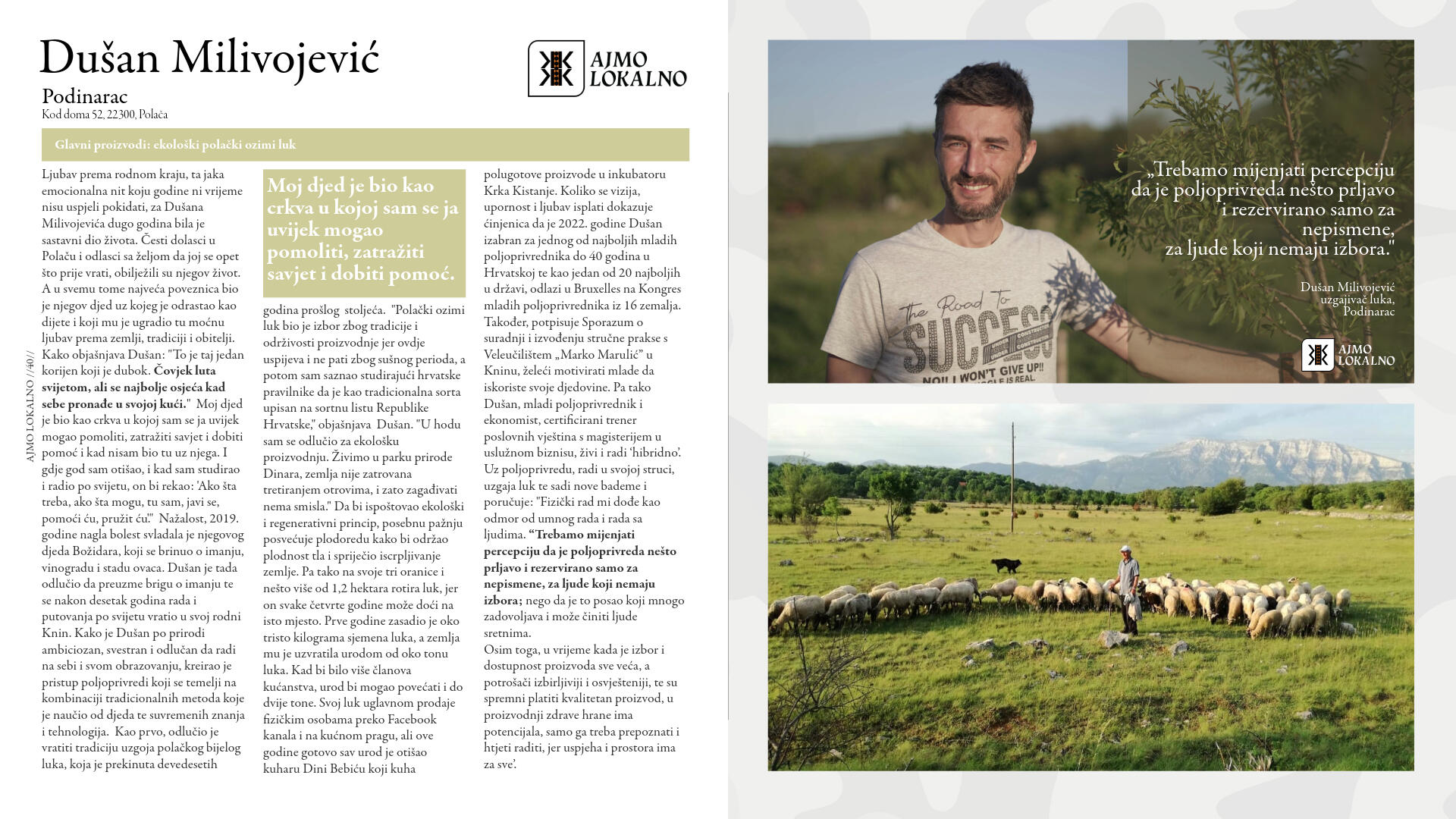 Njihova hrana nije iz laboratorijskog sjemena, do nas ne putuje tisućama kilometara, nije prerano ubrana da bi sazrijevala u prijevozu i tretirana da bi ostala "svježa". Dok se sljedivost industrijski proizvedene hrane gubi u labirintu desetaka tisuća dobavljača, oni znaju točno odakle dolazi njihova hrana, kako je uzgojena i tko je proizvodi.Vidjeli smo da globalni sustavi opskrbe hranom mogu zatajiti u kratkom roku, ali usprkos tome upravo su lokalni proizvođači ostali uz nas. Onda, kao i danas, proizvođači su ti koji snose najveći teret nepredvidljivosti prirodnih mijena, geopolitičkih zbivanja i nestabilnosti tržišta.Ovi ljudi su iskonski čuvari naše baštine, naše zemlje i naše neovisnosti. Vrijeme je da im pružimo ruku podrške, da zajedno stvorimo osviješteniju budućnost u kojoj će plodovi njihovih napora biti prepoznati i nezaobilazno uključeni u našu svakodnevnu prehranu. Kupujući lokalnu hranu, ne hranimo samo svoje obitelji nego i one koji tu hranu proizvode s predanošću i nemalim trudom.Ne zaboravimo da lokalno proizvedena hrana, koja oko naših stolova redovito okuplja obitelji, prijatelje i cijele zajednice, nije samo gorivo za tijelo, već naš način života, naš identitet, naša duša. Zato,