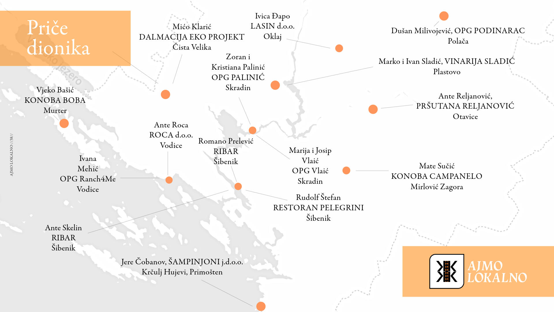 Kriteriji članstva u mreži Ajmo Lokalno:Lokalna proizvodnja i pozitivna reputacijaObavezno: Proizvodi moraju biti proizvedeni u Šibensko-kninskoj županiji, čime se osigurava lokalni karakter mreže i podržava lokalno gospodarstvo.Poželjno: Poticanje korištenja sjemenja autohtonih sorti i uzgoj autohtonih pasmina, regenerativnog poljodjelstva te tradicionalnih metoda proizvodnje lokalnih specijaliteta, što doprinosi očuvanju lokalne baštine i agrobioraznolikosti.Kvaliteta i sigurnost hrane:Obavezno: Proizvodi moraju zadovoljavati zakonske propise o sigurnosti hrane i higijenskim standardima, čime se štiti zdravlje potrošača. Redovite analize hrane i tla te ekotoksikološka ispitivanja proizvoda i zemljišnih tijela jamstvo su zdravstva.Poželjno: Poticanje proizvođača na certificiranje prema nacionalnim ili međunarodnim standardima kvalitete, što potvrđuje kvalitetu i može olakšati plasman proizvoda na tržište.Fleksibilno: Omogućiti manjim proizvođačima da postupno usvajaju standarde kvalitete, pružajući im podršku i edukaciju.