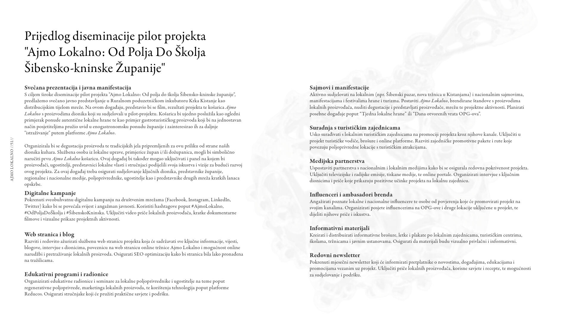 Štoviše, uspjeh mreže Ajmo Lokalno ostvariti će i preduvjete za brendiranje Šibensko-kninske županije kao održivog odredišta, prepoznatljive gastronomije i lokalne proizvodnje hrane, privlačeći posjetitelje koji cijene autentična iskustva i odgovoran pristup prema okolišu i zajednici.