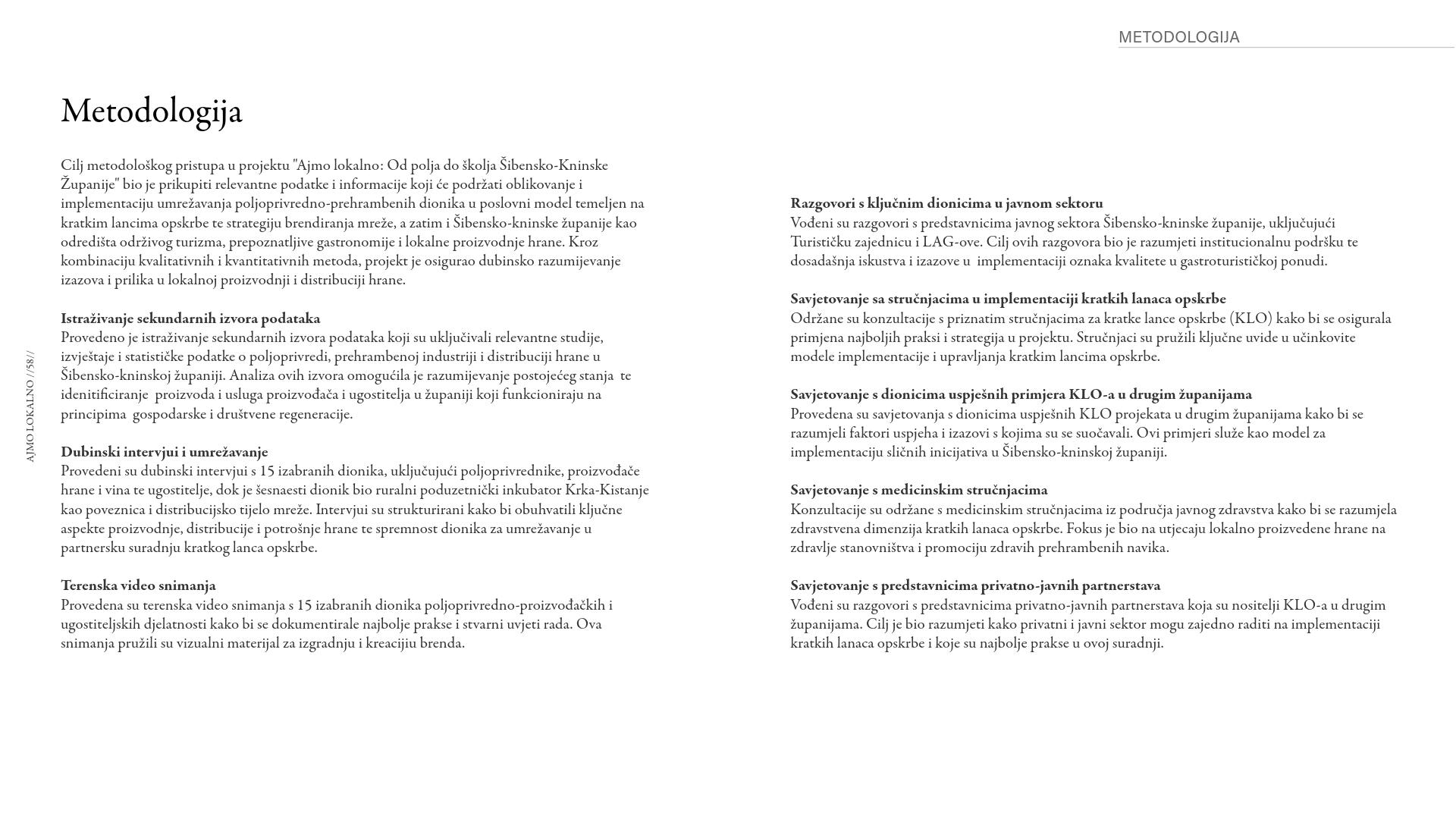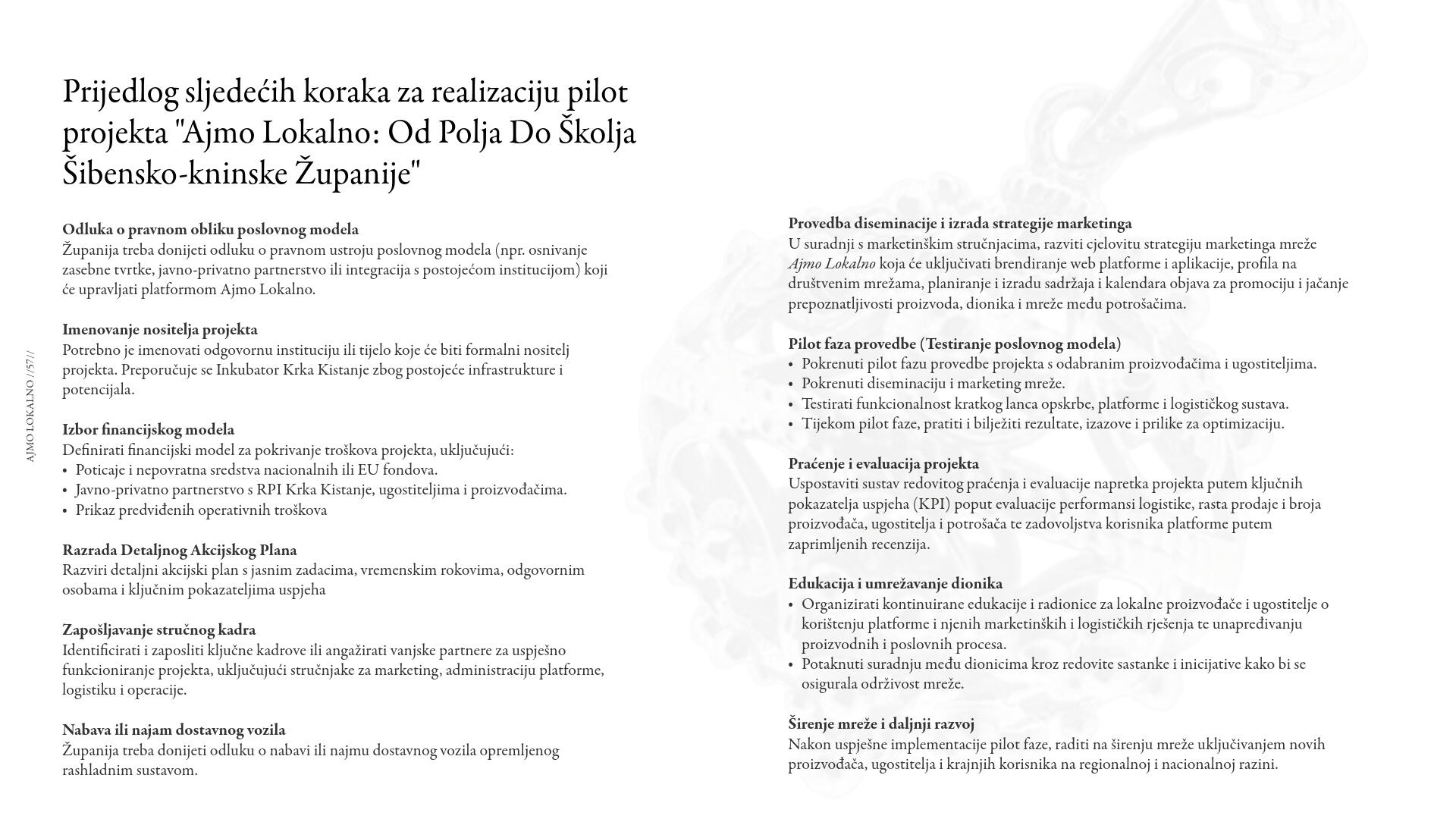 Pilot-projekt Ajmo lokalno: Od polja do školja Šibensko-kninske županije osmišljen je kao kreativna sinteza strateških ciljeva razvoja diverzificiranog i integriranog županijskog tržišta poljoprivredno-prehrambenih proizvoda kroz mrežu kratkih lanaca opskrbe te razvoja i promocije ponude gastroturističkih proizvoda zasnovanih na lokalnim posebnostima i autentičnim kulinarskim iskustvima s ciljem oblikovanja jedinstvenog brenda županije kao destinacije održivog turizma, prepoznatljive gastronomije i lokalne proizvodnje hrane.