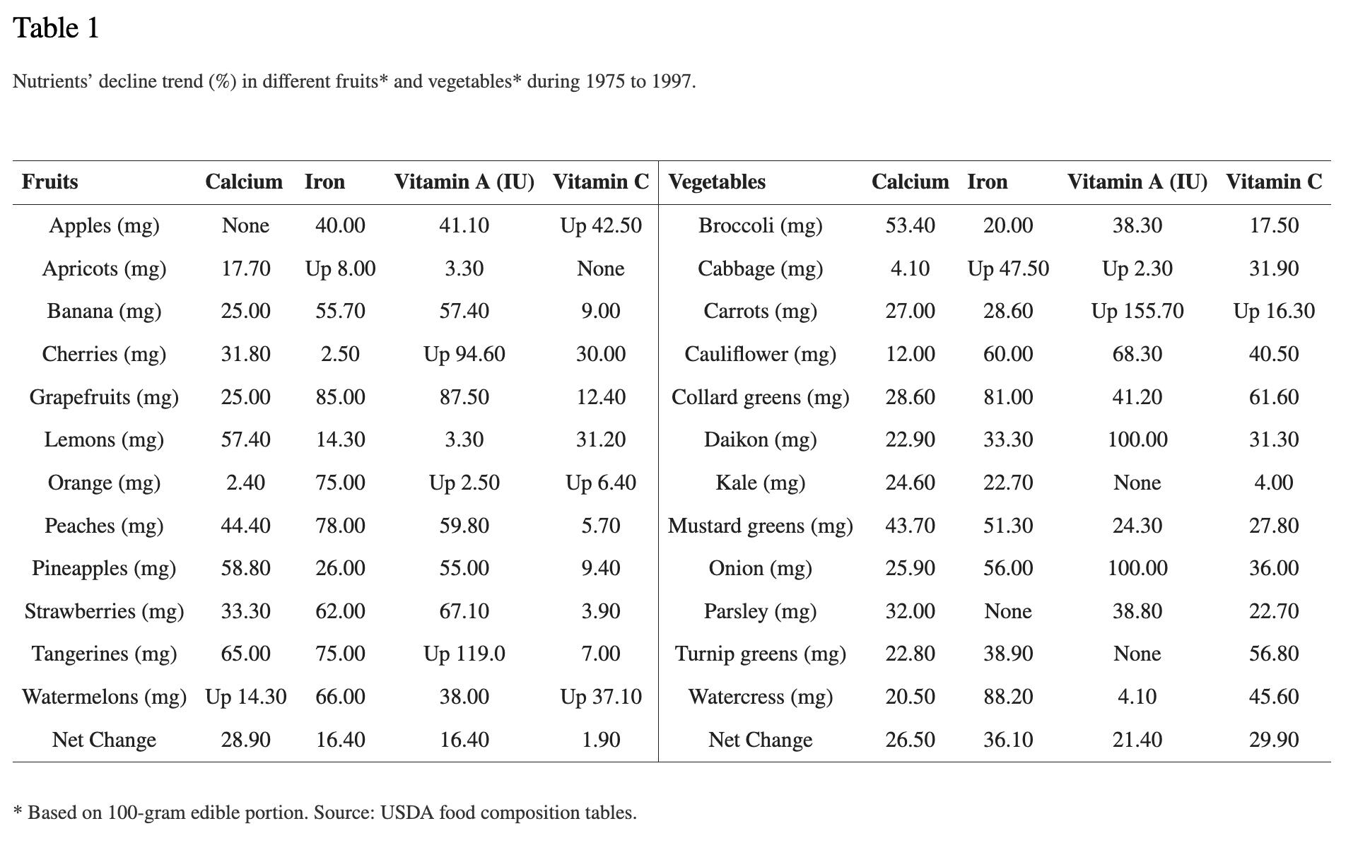 Tablica 1: Pad hranjivih vrijednosti voća i povrća u postocima u periodu od 1975. do 1997. (Lal Bhardwaj et al., 2024).