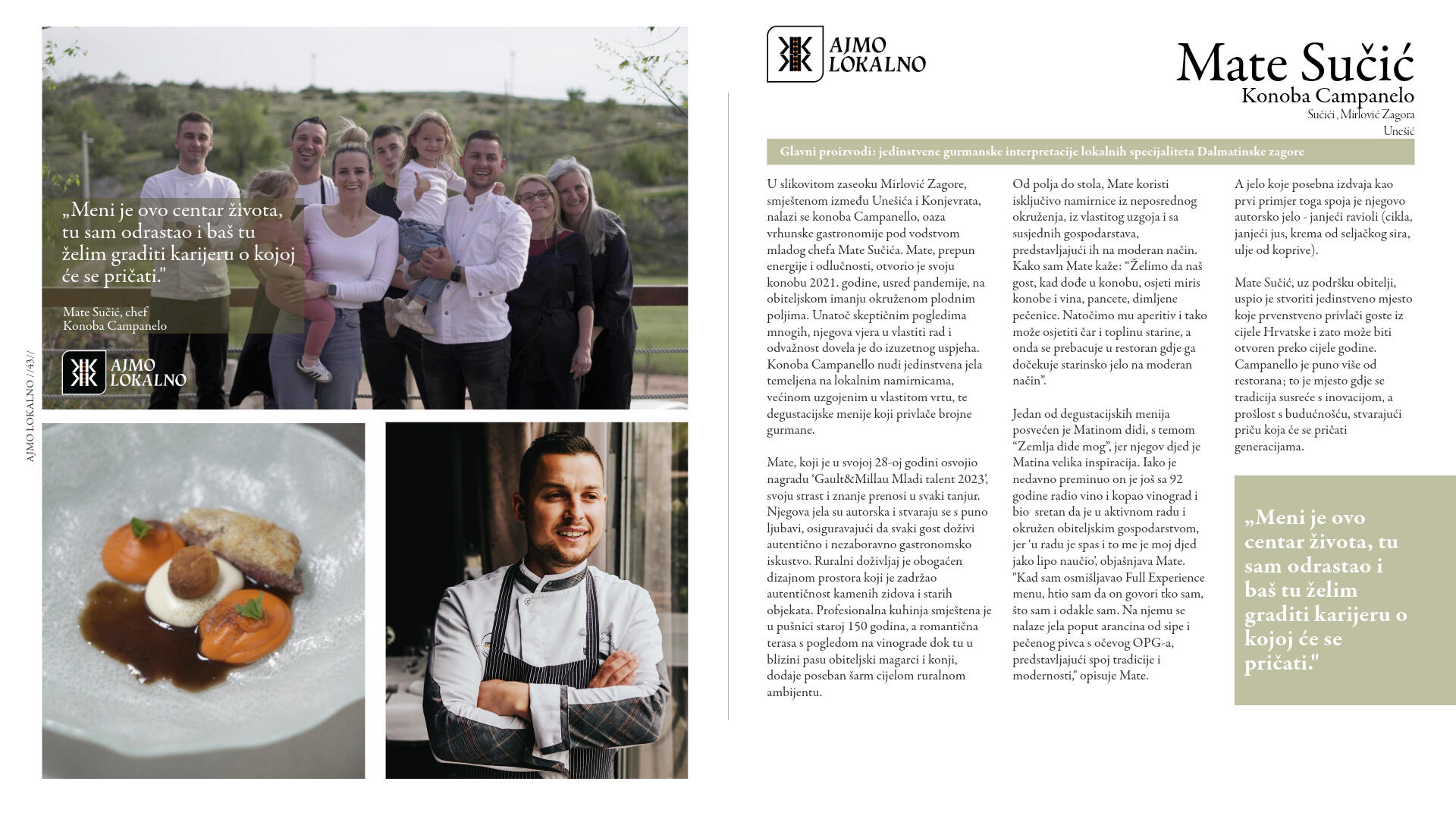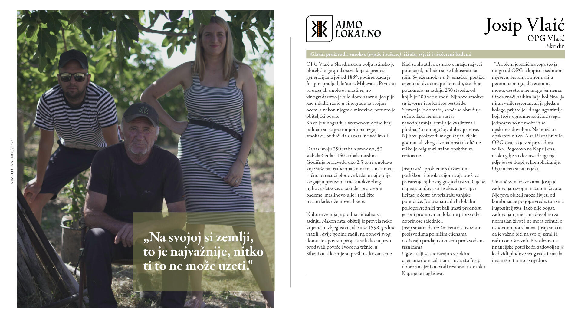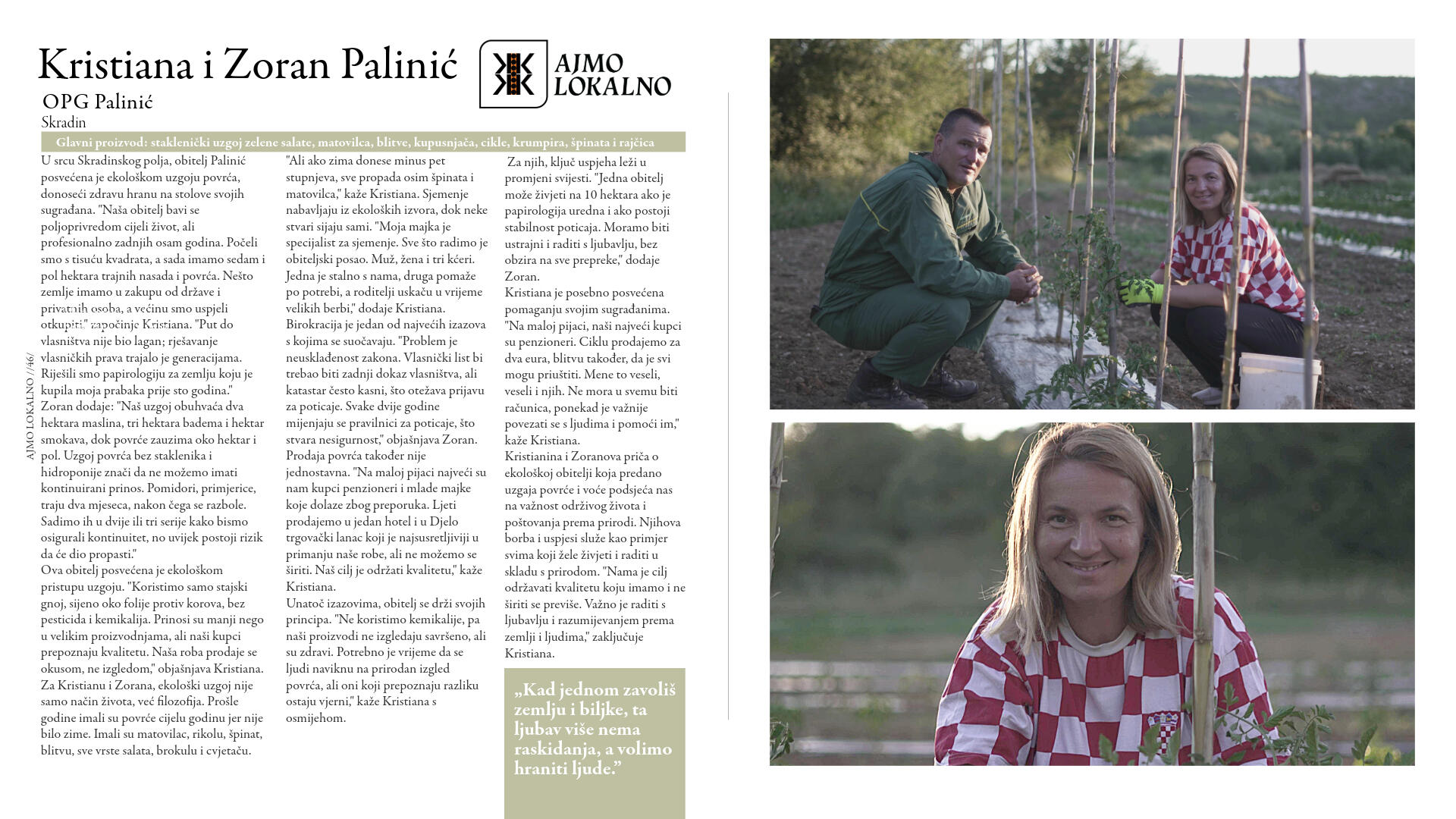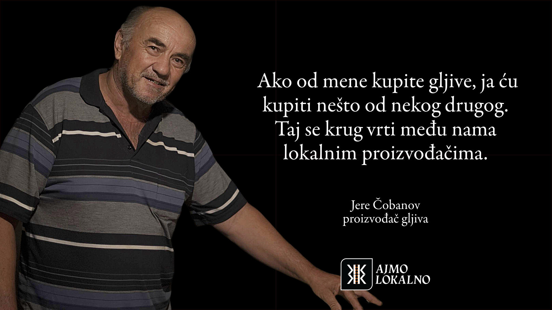 Njihova hrana nije iz laboratorijskog sjemena, do nas ne putuje tisućama kilometara, nije prerano ubrana da bi sazrijevala u prijevozu i tretirana da bi ostala "svježa". Dok se sljedivost industrijski proizvedene hrane gubi u labirintu desetaka tisuća dobavljača, oni znaju točno odakle dolazi njihova hrana, kako je uzgojena i tko je proizvodi.Vidjeli smo da globalni sustavi opskrbe hranom mogu zatajiti u kratkom roku, ali usprkos tome upravo su lokalni proizvođači ostali uz nas. Onda, kao i danas, proizvođači su ti koji snose najveći teret nepredvidljivosti prirodnih mijena, geopolitičkih zbivanja i nestabilnosti tržišta.Ovi ljudi su iskonski čuvari naše baštine, naše zemlje i naše neovisnosti. Vrijeme je da im pružimo ruku podrške, da zajedno stvorimo osviješteniju budućnost u kojoj će plodovi njihovih napora biti prepoznati i nezaobilazno uključeni u našu svakodnevnu prehranu. Kupujući lokalnu hranu, ne hranimo samo svoje obitelji nego i one koji tu hranu proizvode s predanošću i nemalim trudom.Ne zaboravimo da lokalno proizvedena hrana, koja oko naših stolova redovito okuplja obitelji, prijatelje i cijele zajednice, nije samo gorivo za tijelo, već naš način života, naš identitet, naša duša. Zato,