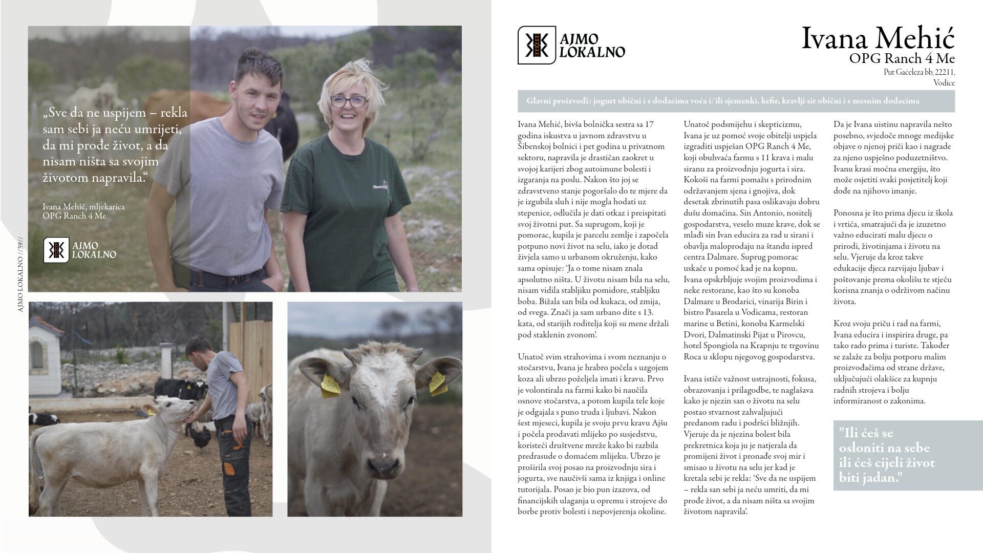 Jedan od najzanimljivijih primjera sinergije između proizvođača i ugostitelja u Šibensko-kninskoj županiji je suradnja Ante Roce, vlasnika Gospodarstva Roca iz Stankovaca, i Ivane Mehić, vlasnice Ranch4Me u okolici Vodica. Ova suradnja objedinjuje kratke lance opskrbe i primjer horizontalnog povezivanja proizvođača, gdje proizvodi s jedne farme postaju ključni sastojci u ponudi druge.Gospodarstvo Roca, poznato po proizvodnji pršuta, kulena, kobasica i drugog mesa, te impresivnom kompleksu koji uključuje restoran i maslenik za bankete, surađuje s Ivanom Mehić koja se bavi uzgojem