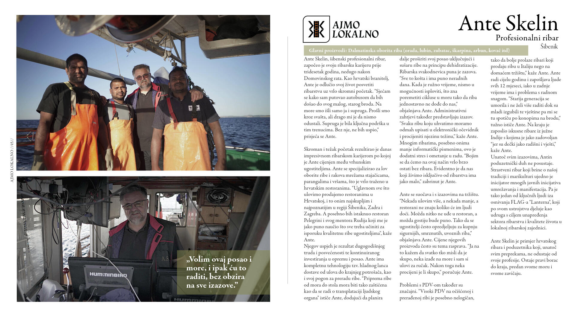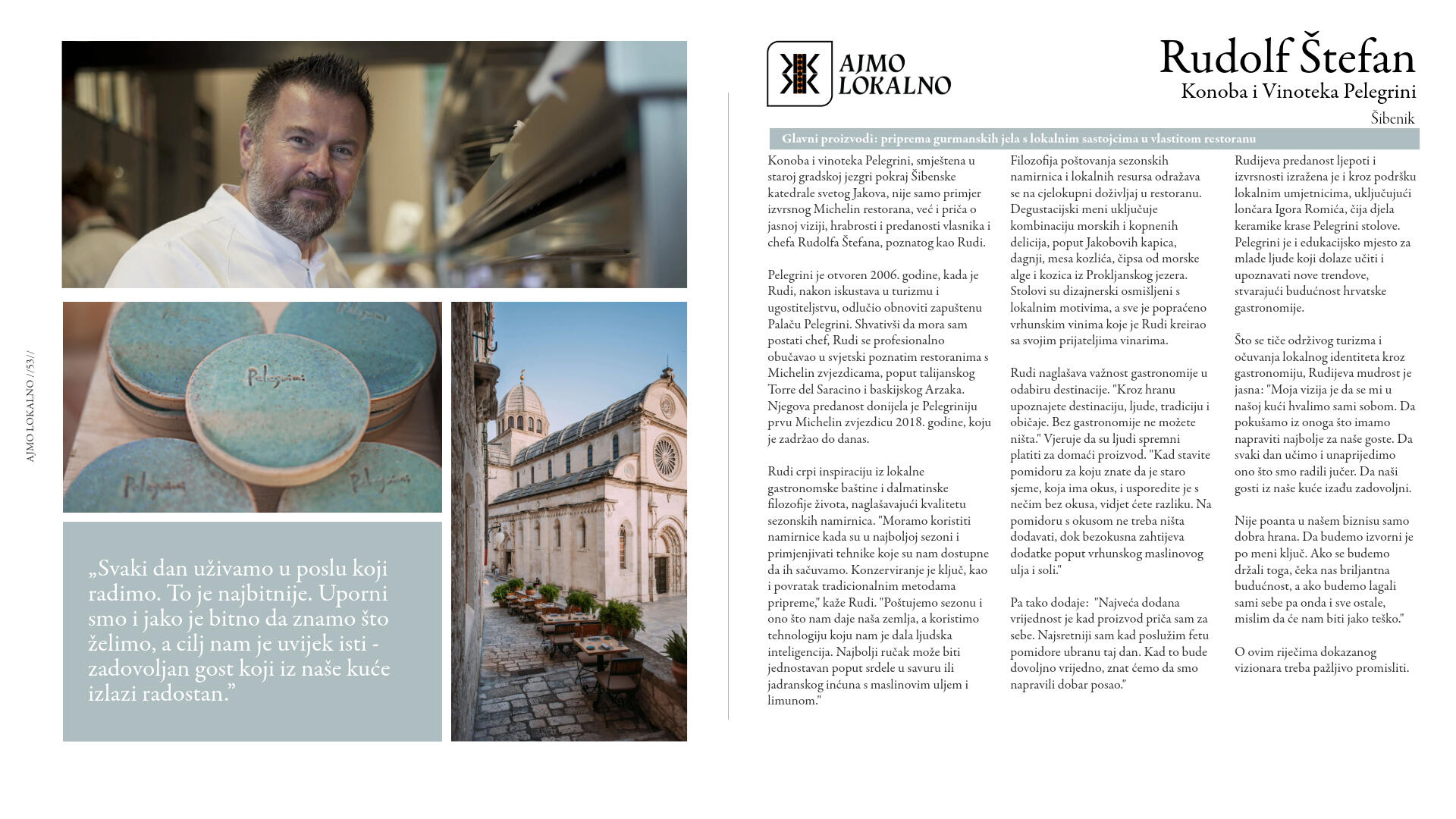 Suradnja Rudija Štefana, vlasnika i chefa nagrađivane Konobe Pelegrini, i Ante Skelina, profesionalnog ribara iz Šibenika, ogledni je primjer kako se autentični, lokalni proizvodi poput visokokvalitetne oborite ribe iz šibenskog akvatorija mogu uspješno plasirati kroz kratke lance opskrbe, unoseći svježinu i izvornost u vrhunsku gastronomiju. Partnerski odnos Štefana i Skelina se temelji na povjerenju, bliskoj suradnji i dubokom razumijevanju potreba obje strane – Štefan kao ugostitelj s visokim standardima kvalitete, i Skelin kao iskusni profesionalni ribar i vlasnik dostavnih vozila s rashladnim uređajima za termički ispravnu dostavu ribe.