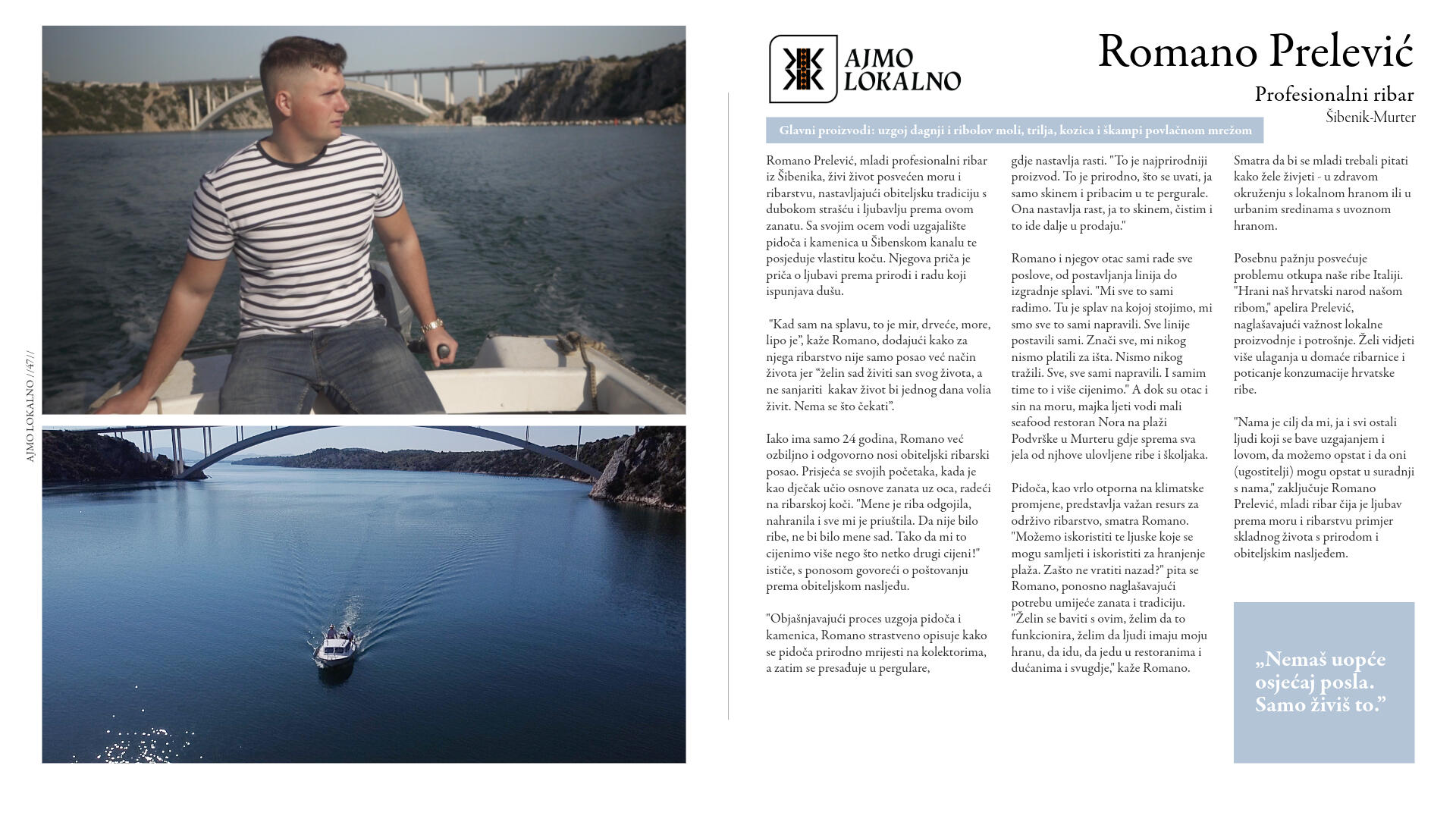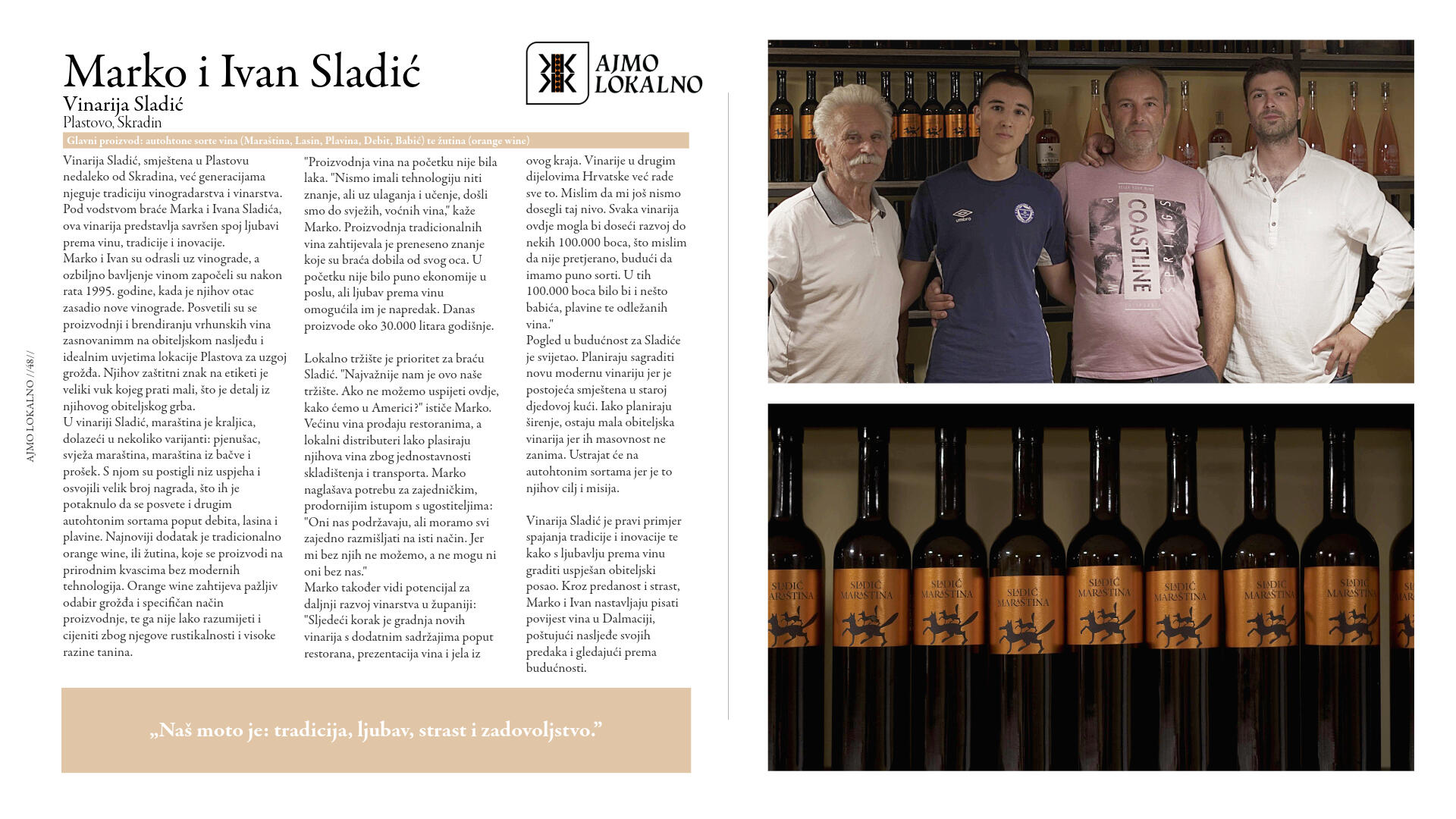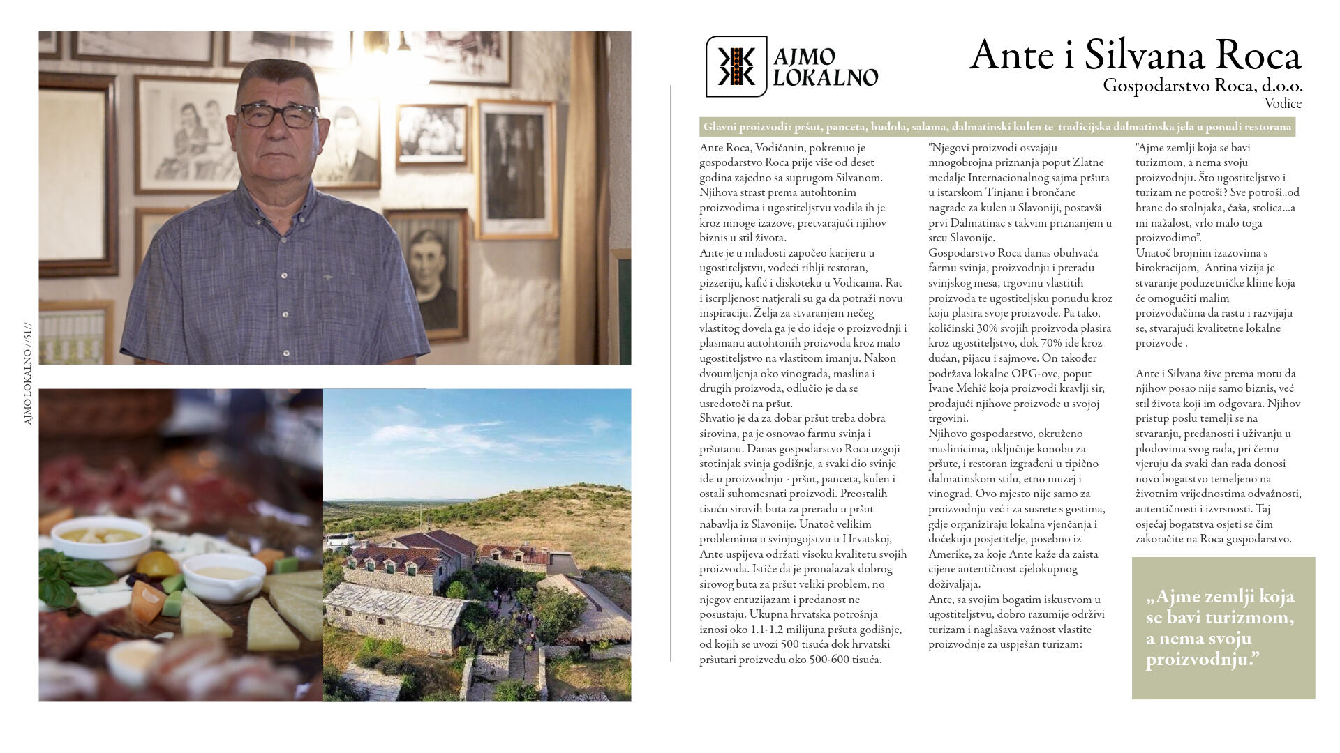 Danas, u svijetu brze hrane i industrijalizirane poljoprivrede, još uvijek postoje čuvari tradicije koji skrbe o proizvodnji zdrave, domaće hrane. To su naši susjedi, vrijedni ljudi čija imena možda ne znamo, ali čiji trud okusimo u svakom zalogaju i svakom gutljaju domaćih jela i pića. Njihov je posao nerijetko i njihov životni poziv: ribari čiji se dan rađa s izlaskom sunca, poljoprivrednici čiji žuljeviti dlanovi nose tragove mukotrpnog rada na poljima, ugostitelji čija jela pričaju priču o našoj baštini.