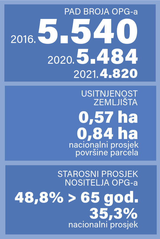 Prosječna veličina površina ARKOD parcela u županiji iznosila je 0,57 ha u 2021. godini, što je niže od nacionalnog prosjeka od 0,84 ha po parceli, ukazujući na izraženu rascjepkanost i usitnjenost.Natprosječna starost nositelja poljoprivrednih gospodarstava